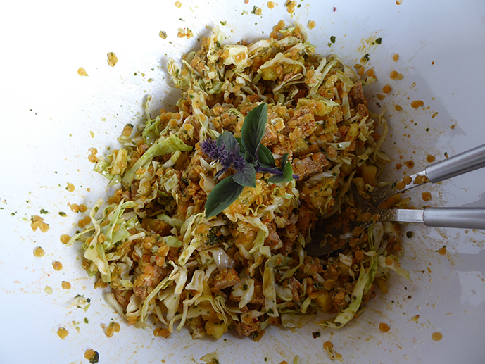 1 Tasse rote Linsen kochen, mit kaltem Wasser spülen und in eine Schüssel geben